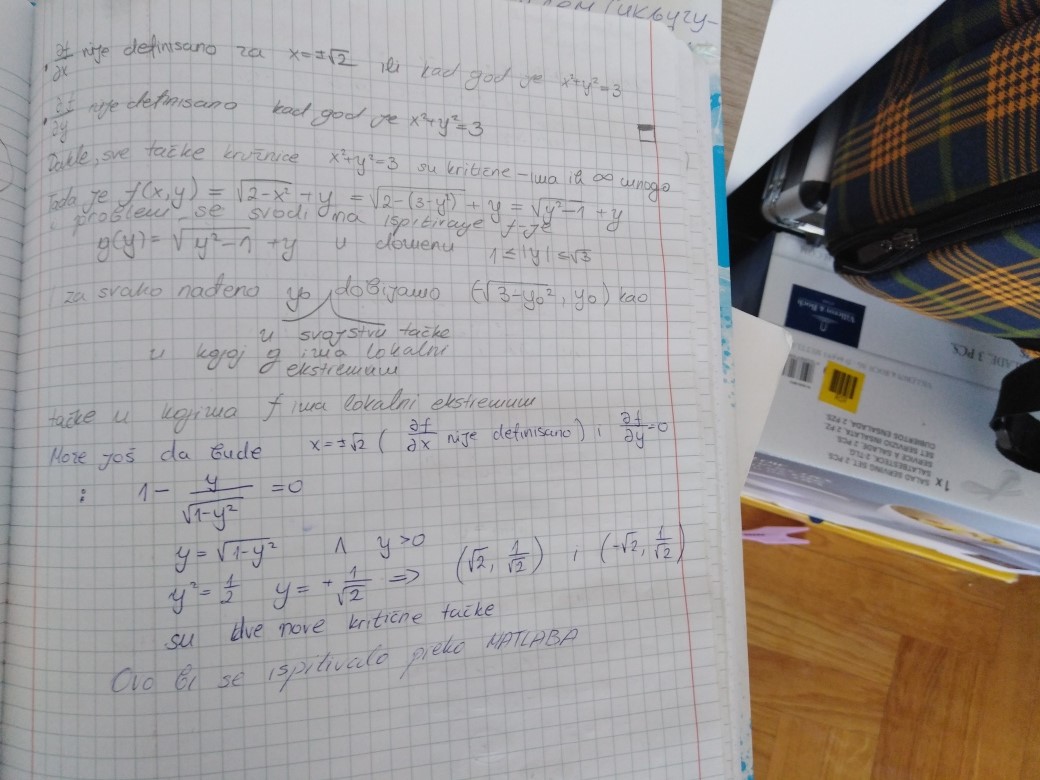 Studentima se, dakle, preporucuje da najpre iz Udzbenika prouce sekciju 4.5.3 zajedno sa 5 resenih primera na str. 205-207, a zatim zadatke 4.21 - 4.24. Nakon toga treba da predju na slucaj funkcija sa vise od dve promenljive, detaljno opisan na sledece 4 stranice beleski.
