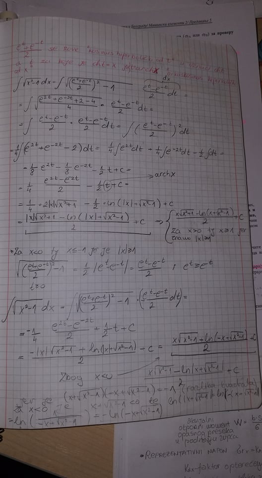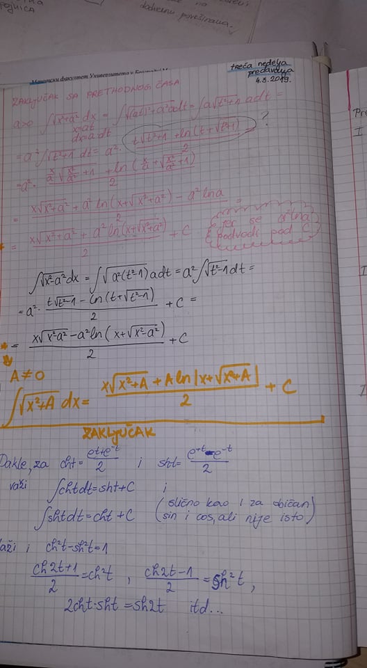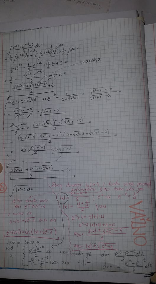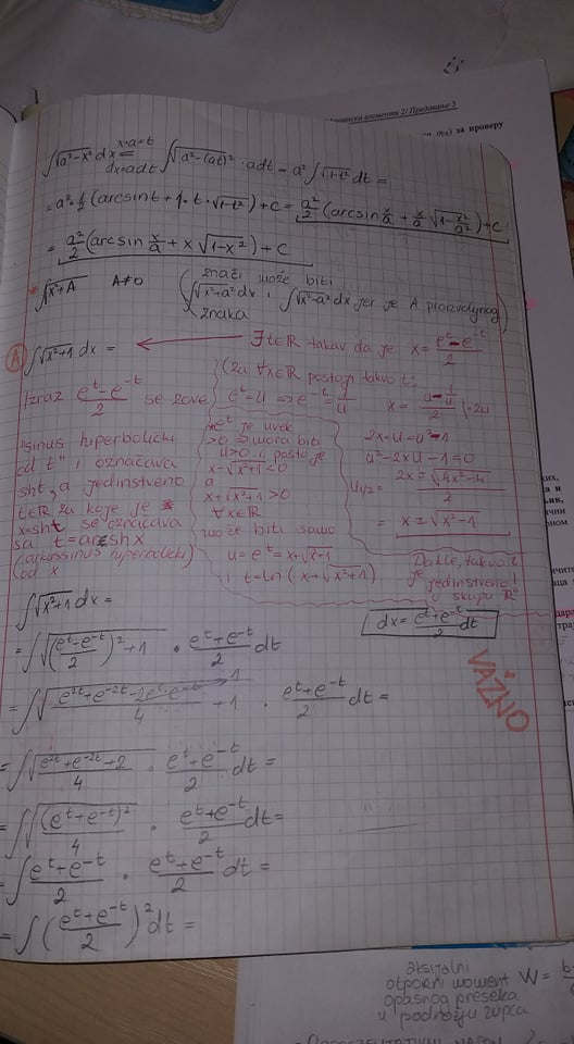 Prva fotografisana stranica se odnosi na uvodjenje trigonometrijske smene integralu ''koren iz (a^2-x^2)'' vec resavanom pomocu parcijalne integracije, a zatim sledi objasnjenje kako se uvode odgovarajuce smene (to su te tzv. hiperbolicke) ukoliko se pod korenom x^2 nalazi u plusu, koji je takodje radjen na nastavi metodom parcijalne integracije.