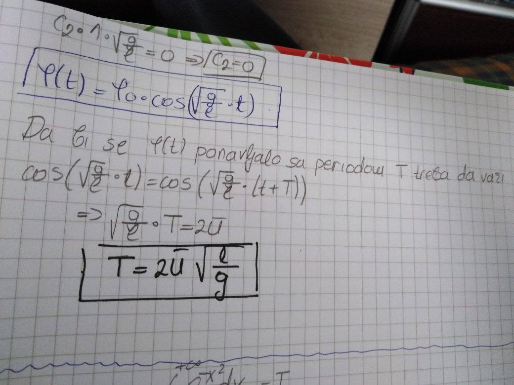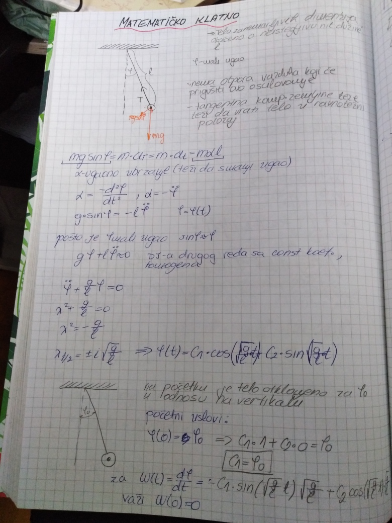 Pretpostavlja se da su se svi studenti u srednjoj (pa cak i osnovnoj) skoli sreli sa formulom za period oscilovanja matematickog klatna. U prilozenom materijalu je ta formula izvedena iz jednacine oscilovanja matematickog klatna, koja kao sto se studenti mogu uveriti, predstavlja linearnu DJ 2.reda sa konstatnim koeficijentima. S obzirom na to da se radi o jednoj od najosnovnijih tema iz Mehanike, svaki ijole ozbiljniji student bi trebalo da prouci ovo izvodnjenje, jer razvijanje sposobnosti za modelovanje i razumevanje ovakvih procesa upravo i jeste primarni cilj ucenja matematike na Masinskom fakultetu.