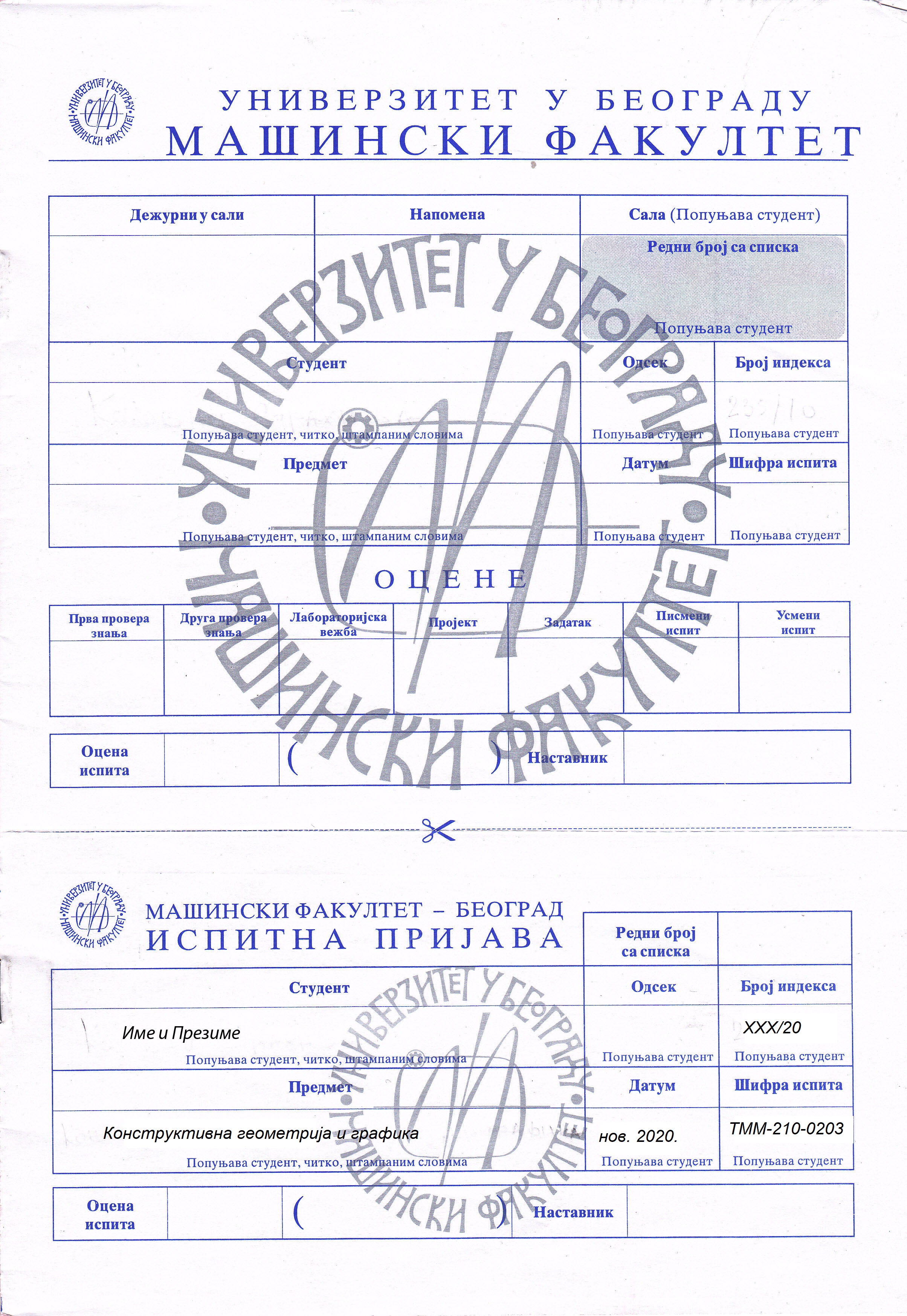 За упис коначне оцене (студенти који су положили предмет и пријавили испит у овом испитном року) треба да понесу попуњен индекс и радну свеску (купује се у скриптарници Машинског факултета). Пример попуњеног индекса и радне свеске је у прилогу.