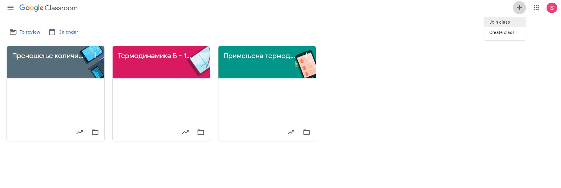 За успешно пријављивање на платформу google classroom потребо је улоговати се на платформу, након тога кликнути на дугме + у горњем десном углу и опцију Join class (слика 1) након чега ће се отворити прозор у који је потребно унети одговарајући код предмета (слика 2).