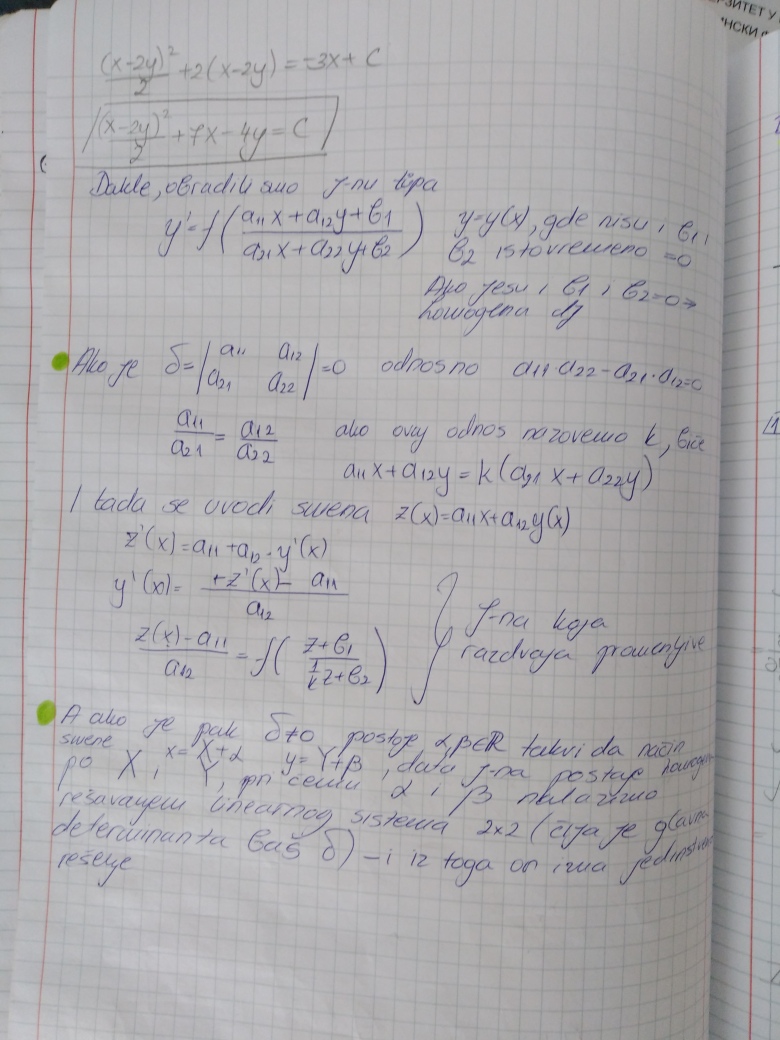 Uz izvinjenje sto su danasnje predavanje i vezbe morali da se pomere u popodnevnu smenu, u prilogu se ostavlja materijal na jednu jako vaznu temu koja ima veze sad prethodnom oblascu, a to je DIferencijalna jednacina u formi totalnog diferencijala (uz objasnjenje sta je to Integracioni faktor). Usput su jos provezbani zadaci na temu tipova DJ ispredavanih prosle nedelje (materijal DJ1.pdf), a neke od prezentovanih metoda za resavanje istih uopstene (nadogradjene).