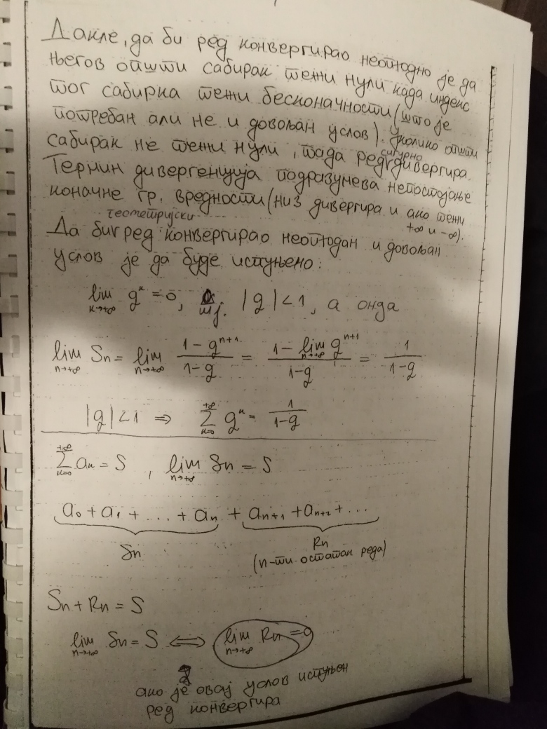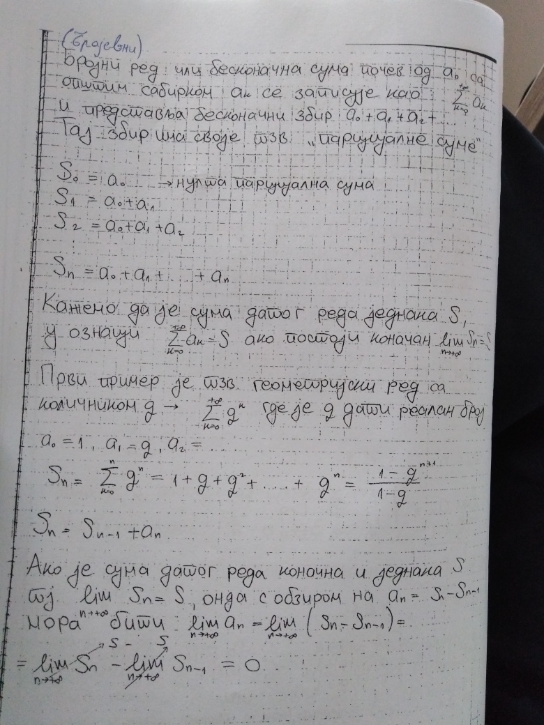 Prvo (sutrasnje - uvodno) predavanje, koje se dakle ''drzi'' na ovaj nacin - ostavljanjem materijala u elektronskom obliku, se odnosi na osnovne pojmove i primere vezane za brojevne redove. Da bi se mogla definisati konvergencija brojevnog reda, neophodno je podsetiti se osnovnih pojmova vezano za konvergenciju brojevnih nizova (Matematika 1), cemu je posvecen dokument Konvergencija.pdf, nakon cega sledi 7 stranica detaljnih beleski od kojih prve dve sadrze najosnovniji pojmove vezane za konvergenciju nizova, dok su preostalih 5 posvecene bas konvergenciji redova.