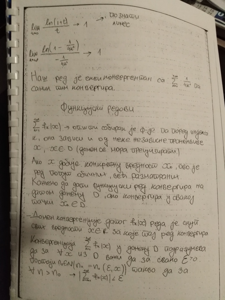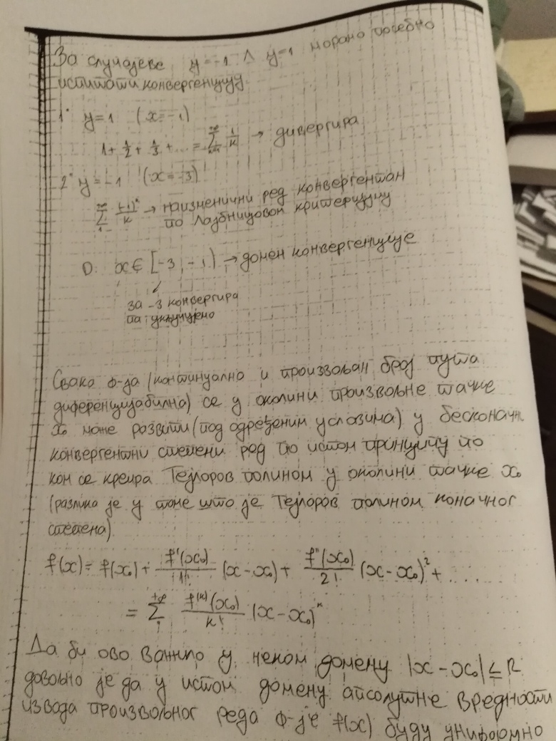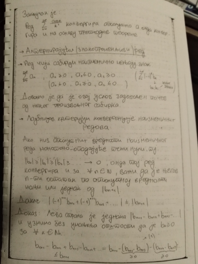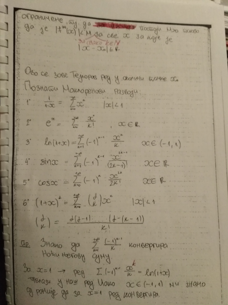 Ovim je teorija na temu Redova kompletno zaokruzena (Furijeovi redovi se ne predaju na ovom predmetu). Za 18.oktobar se planiraju javne konsultacije (predavanje uzivo), a za 25.oktobar Prvi kolokvijum. Na kolokvijumu ce biti 3 zadatka na temu Redova, dok ce jedan zadatak biti na temu zaokruzivanja numerickih podataka, gresaka i znacajnih cifara (u vezi sa cim ce studenti do 18.oktobra dobiti materijal, zadatak iz ovog dela gradiva uvek bude najlaksi na kolokvijumu).