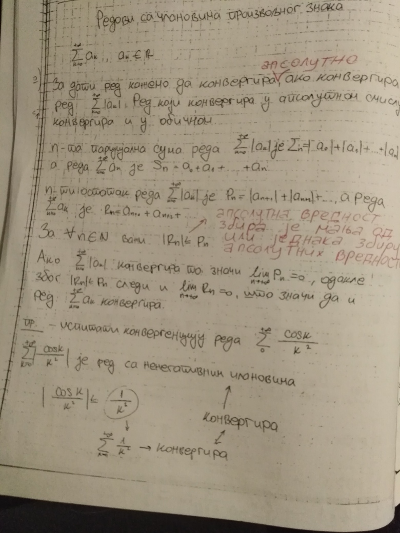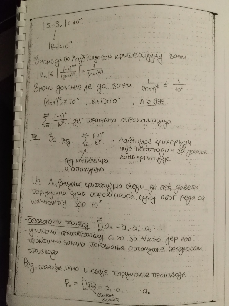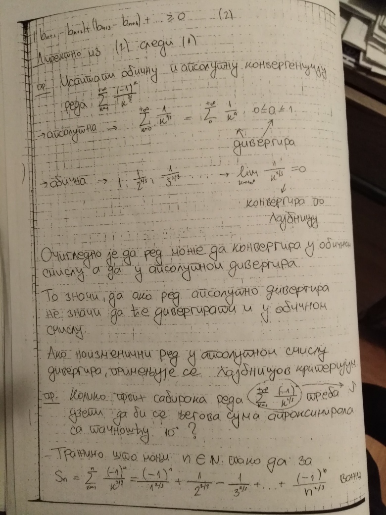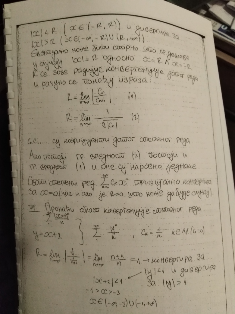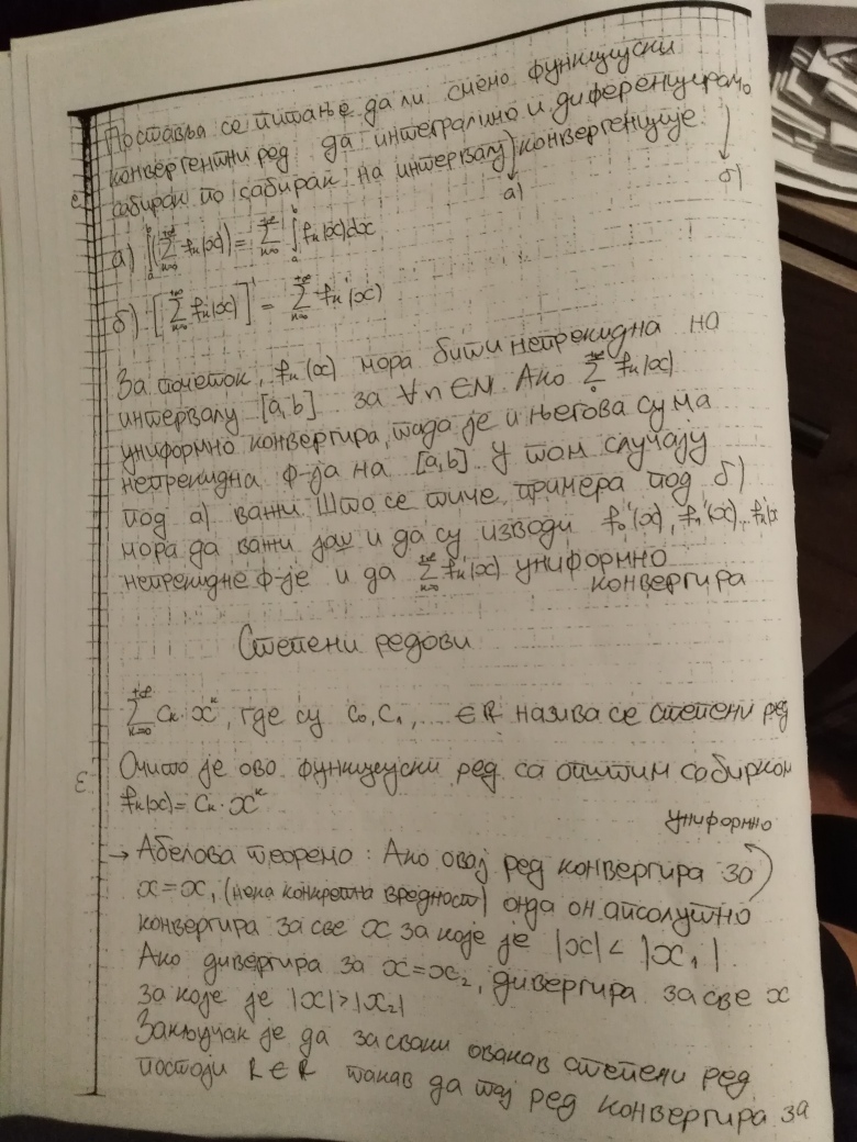 Ovim je teorija na temu Redova kompletno zaokruzena (Furijeovi redovi se ne predaju na ovom predmetu). Za 18.oktobar se planiraju javne konsultacije (predavanje uzivo), a za 25.oktobar Prvi kolokvijum. Na kolokvijumu ce biti 3 zadatka na temu Redova, dok ce jedan zadatak biti na temu zaokruzivanja numerickih podataka, gresaka i znacajnih cifara (u vezi sa cim ce studenti do 18.oktobra dobiti materijal, zadatak iz ovog dela gradiva uvek bude najlaksi na kolokvijumu).