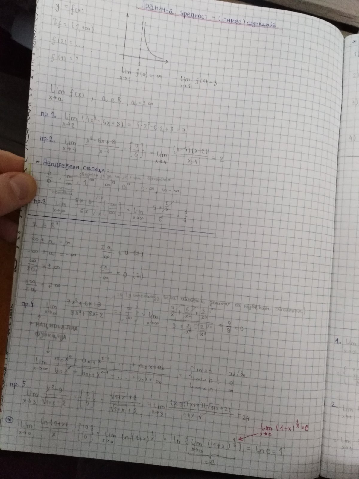U prilogu je ponovo ostavljen materijal koji je u sklopu Uvodne nastave ostavljen pre mesec i po dana na temu osnova Diferencijalnog racuna i standardnih zadataka vezanih za nalazenje granicnih vrednosti za koje nije odmah ocigledno koliko iznose (priredjen od strane jednog od predmetnih nastavnika), za kakve se podrazumeva da su studentima poznati jos iz srednje skole, a zatim tekuca predavanja o limesima i izvodima jedno za drugim (pritom se pojedini zadaci na temu limesa resavaju Lopitalovim pravilom, jer se podrazumeva da su svi studenti u srednjoj skoli naucili da nadju izvod, a sad eventualno obnovili kroz materijal iz prvog od ostavljenih dokumenata).