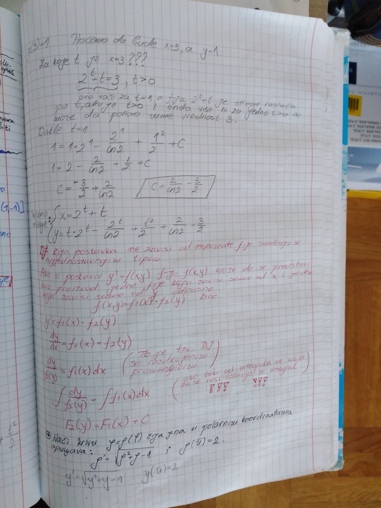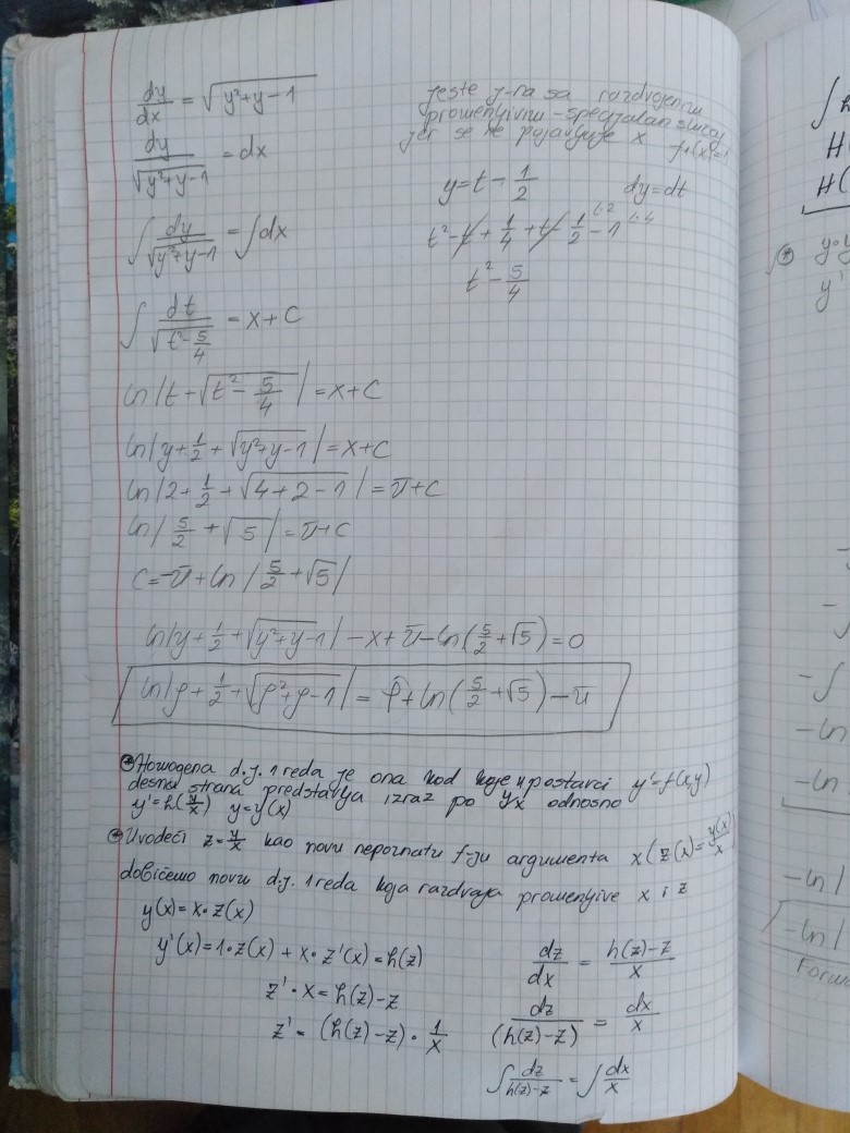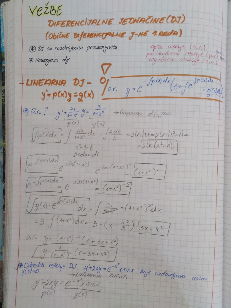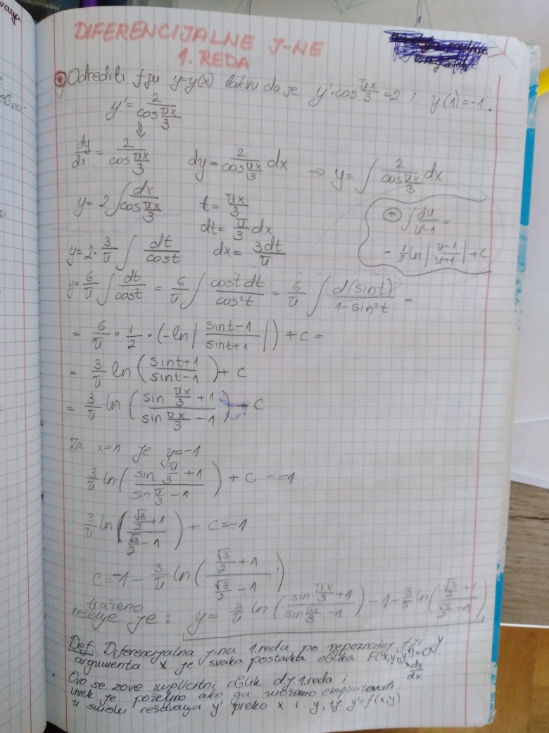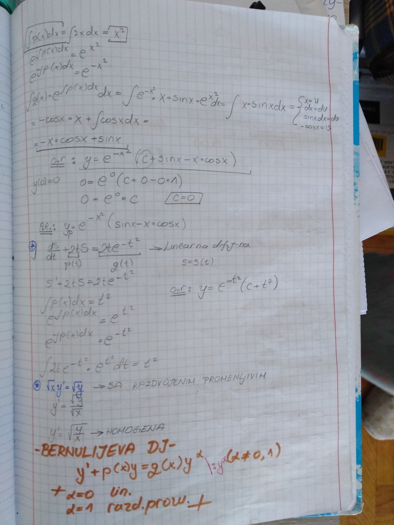 Prelazi se na poslednju oblast u ovom semestru, a to su Diferencijalne jednacine 1. reda (Drugi kolokvijum ce vise od 50% biti posvecen njima). U prilogu su dati prvo predavanje i vezbe na ovu temu (vezbe su zapravo nastavak predavanja), ciji je cilj da klasifikuju najosnovnije tipove diferencijalnih jednacina 1. reda zakljucno sa Linearnom i Bernulijevom diferencijalnom jednacinom 1.reda.