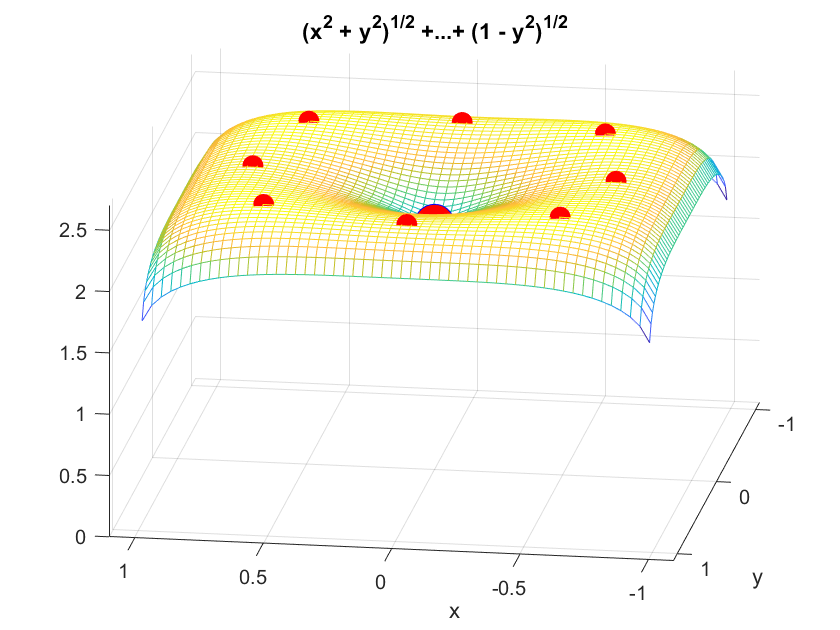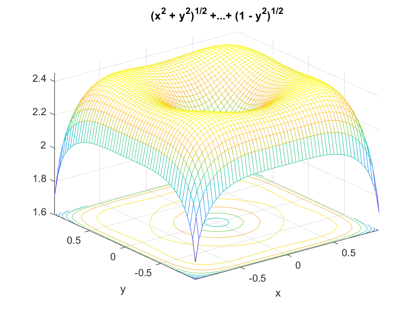 z=sqrt(x^2+y^2)+sqrt(1-x^2)+sqrt(1-y^2) %zadata povrs kao predstavljena simbolickim izrazom