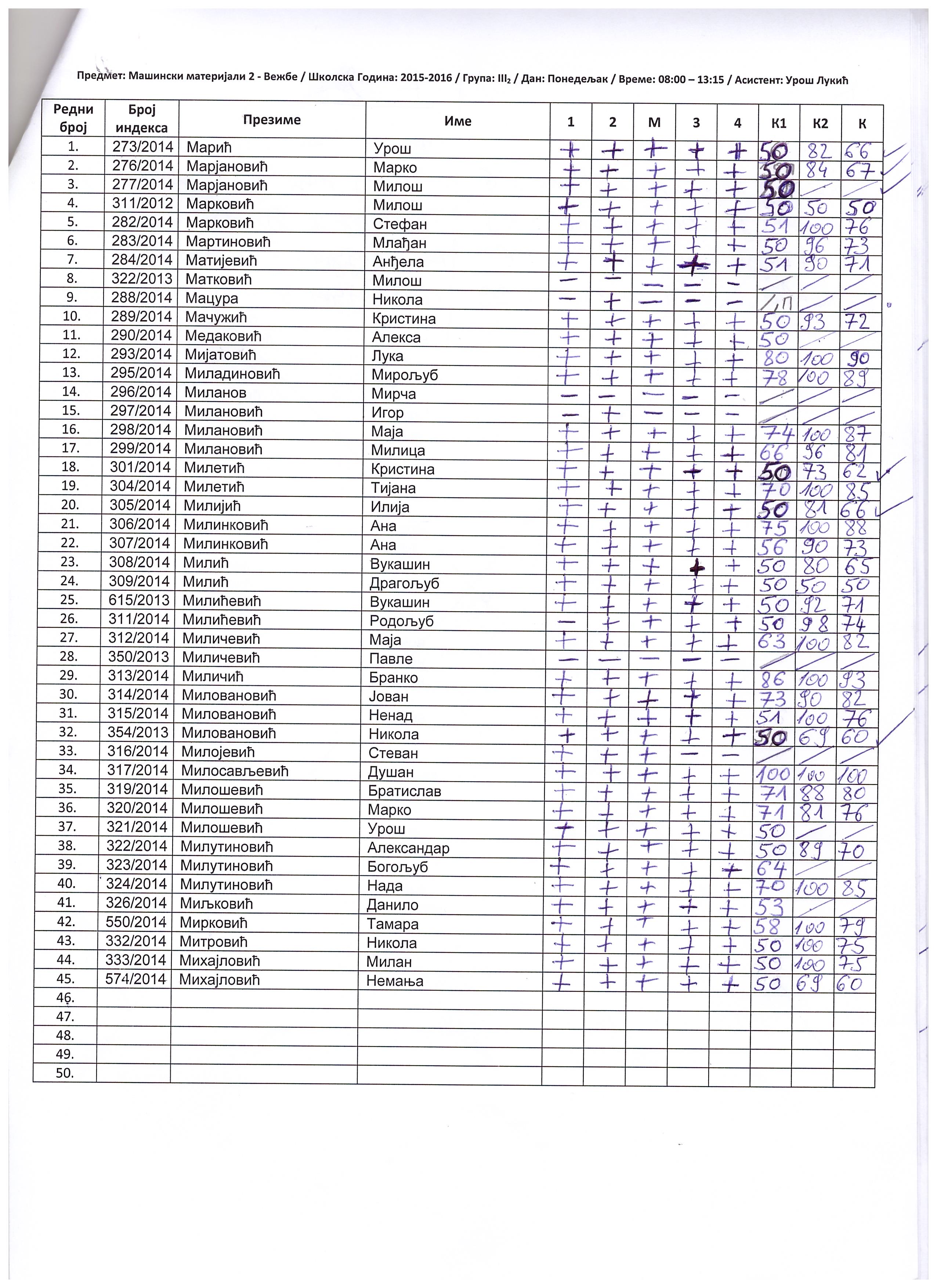 Rezultati drugog kolokvijuma iz predmeta Masinski materijali 2 za studente I/1, III/2 i V/2 grupe