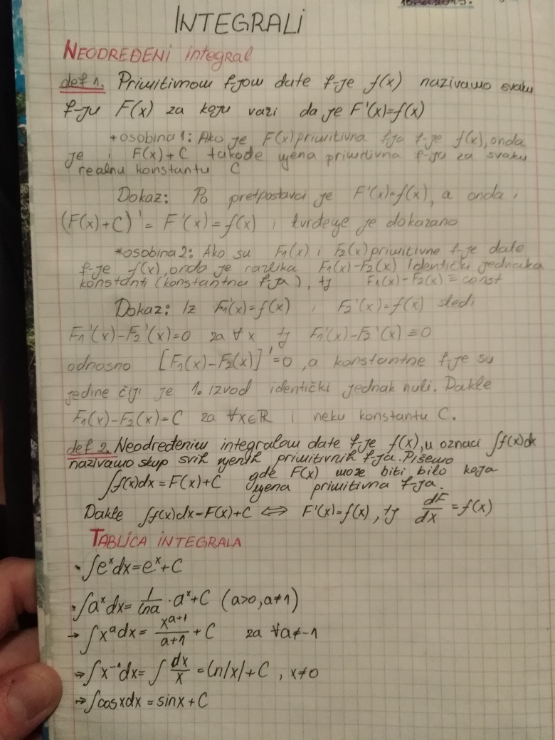 U prilogu su beleske vezano za 1.lekciju (OBNOVITI SVA PRAVILA VEZANO ZA IZVODE I PRE SVEGA PRVI DIFERENCIJAL I TABLICU OSNOVNIH INTEGRALA). Integrali se smatraju radjenim u srednjoj skoli, a posvecen im je i deo Uvodne nastave za brucose jesenas.