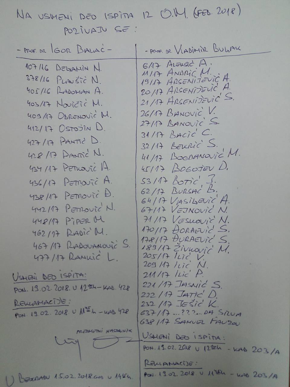 Rezultati ispita Otpornost materijala februar 2018-profesori Balac i Buljak